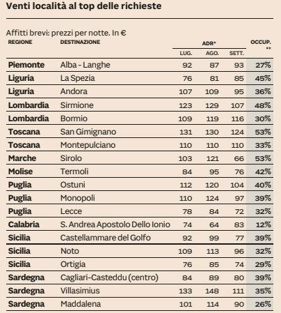 Nella tabella che vuole dare una idea del prezzo medio sono state analizzate 20 tra le località più richieste, tutti appartamenti che si trovano online sui portali. Si tratta di una media che comprende case “base” e case di lusso, quindi il prezzo è indicativo. E bisogna anche sottolineare che il tasso di occupazione raccolto ultimi 12 mesi costruito come notti vendute/notti disponibili non tiene in realtà conto della stagione che sta partendo. «Nelle località stagionali di mare e montagna gli annunci di case da locare a breve termine sono aumentate online o offline perché già dallo scorso anno si è visto che molte persone preferivano andare in casa piuttosto che in hotel. Da segnalare – afferma Marco Celeni – presidente Aigab – anche un forte attrazione verso località secondarie. Anche se in diversi casi gli affittuari si focalizzano su periodi lunghi di oltre un mese per fare lavoro da remoto da luoghi di vacanza insieme alla famiglia». E questo non rientra negli affitti brevi che è corrispondono a pernotti con meno di 30 giorni. «Nei numeri la ripresa è ancora lenta, soprattutto perché per le località di vacanza la stagione sta iniziando proprio in questi giorni ed è difficile in corporare domanda e occupazione nei dati. Sicuramente – racconta ancora Celani – c’è stato un crollo dell’occupazione nel 2020, dovuto in primis al fatto che come spiegato in quell’anno si sono avute meno notti disponibili rispetto ai periodi precedenti. «Sono scese anche le tariffe – continua ancora – perché sono mancate le destinazioni city, storicamente le più care. Per il 2021 vediamo tariffe stabili, sottoposte alle stesse dinamiche». Ma da Aigab segnalano anche che si sta allungando il periodo di permanenza. Un soggiorno dura in media 19 notti, due anni fa 11 notti. «È presto per fare previsioni – dice Celani -. In questi giorni, per esempio, tutti stiamo registrando record di richieste, ma abbiamo anche picchi di cancellazioni. Dato che per via del Covid sono cambiate le politiche tariffarie dando la possibilità di cancellare la prenotazione anche a ridosso dell’arrivo adesso si arriva a disdette dal 30 al 50%». C’è, infatti, chi prenota più opzioni e poi in base alle date di vaccini e richiami cambia prenotazione.
