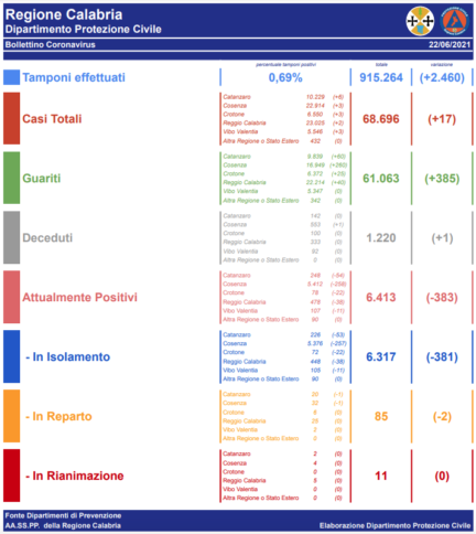 – Crotone: CASI ATTIVI 78 (6 in reparto, 0 in terapia intensiva, 72 in isolamento domiciliare); CASI CHIUSI 6472 (6372 guariti, 100 deceduti)