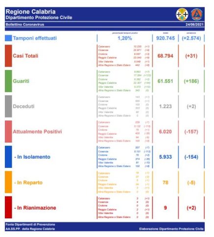 – Reggio Calabria: CASI ATTIVI 400 (24 in reparto, 2 in terapia intensiva, 374 in isolamento domiciliare); CASI CHIUSI 22640 (22307 guariti, 333 deceduti)