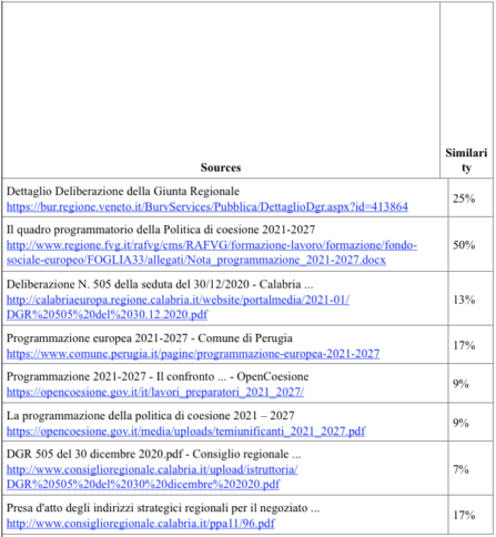 Ho preso in esame, per motivi di tempo, solo il punto 1.8 del nuovo documento licenziato dalla commissione il 21 giugno e approvato dal consiglio regionale. Di seguito potete trovare il report rilasciato dal software utilizzato, quello per capirci che si usa per stabilire se uno studente ha copiato o meno la tesi di laurea.