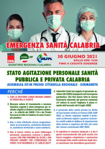 Fp Cgil Cisl FP Uil Fpl hanno proclamato «lo stato di agitazione degli operatori della sanità pubblica e privata ed indetto un sit in davanti alla Cittadella regionale, giorno 30 giugno alle ore 10, sostenute dalle rispettive Confederazioni regionali e dalle Categorie dei Pensionati, per chiedere che si manifesti con azioni tempestive e concrete la volontà di risolvere i disagi dei lavoratori e dei cittadini calabresi da parte di chi ha responsabilità e compiti istituzionali nel governo del Sistema Sanitario Regionale».