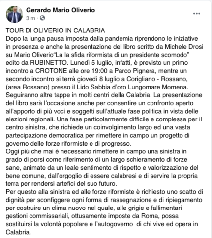CATANZARO Oliverio torna in campo o, meglio, ci resta dopo la conferenza stampa in cui ha sconfessato la linea del Partito democratico nella marcia di avvicinamento alle Regionali. La “scusa” è la presentazione del libro di Michele Drosi “La sfida riformista di un presidente scomodo” (edito da Rubettino, che per un refuso diventa Rubinetto); con la ripresa delle iniziative in presenza, il volume tornerà in una serie di incontri pubblici che, prevedibilmente, daranno all’ex governatore la possibilità di soffermarsi nell’agone politico a campagna elettorale in corso.