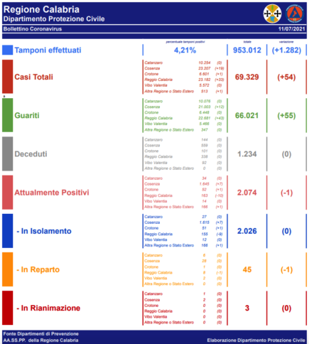 In Calabria, ad oggi, il totale dei tamponi eseguiti sono stati 951.730. Le persone risultate positive al Coronavirus sono 69.329 (+54) rispetto a ieri. Questi sono i dati giornalieri relativi all’epidemia da Covid-19 comunicati dai Dipartimenti di Prevenzione delle AA.SS.PP. della Regione Calabria.
