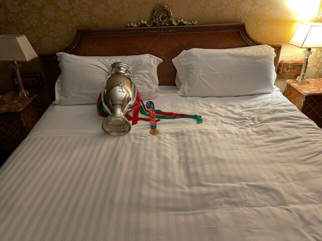 Questa mattina Chiellini, che è arrivato in hotel trionfante, esibendo la coppa con una corona in testa. Subito dopo essere arrivato in camera ha postato una foto su twitter della coppa poggiata sul letto e ha scritto «seguendo la tradizione di un grande maestro». E’ un omaggio a Cannavaro, il capitano che nel 2006 insieme ai suoi compagni di squadra aveva vinto i Mondiali.