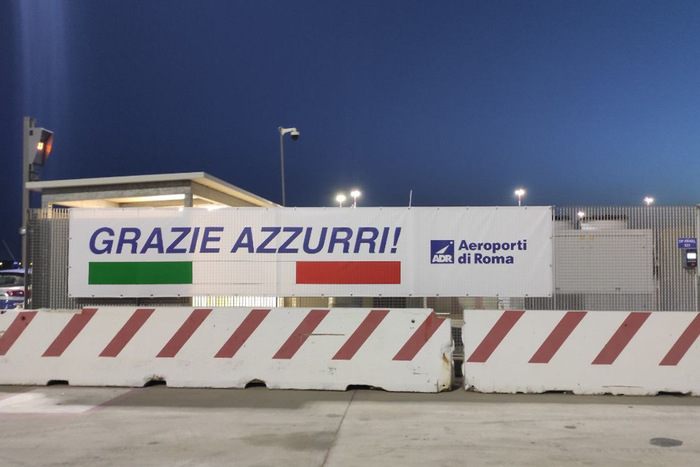 I tifosi che hanno aspettato l’atterraggio degli azzurri all’aeroporto di Fiumicino sventolavano bandiere tricolore mentre intonavano cori: «I campioni dell’Europa siamo noi» e «Po po po po». Ad applaudire e a partecipare al clima di festa anche decine di operatori aeroportuali che si sono radunati sotto l’aereo.