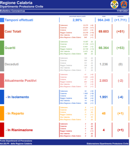 In Calabria, ad oggi, il totale dei tamponi eseguiti sono stati 964248 (+1.711).