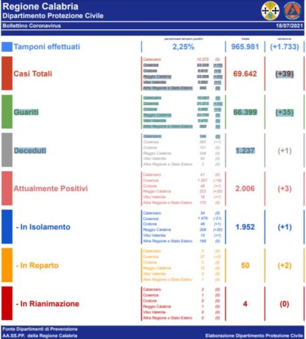 Le persone risultate positive al Coronavirus dall’inizio dell’epidemia sono 69642: appunto 39 in più rispetto a ieri. Questi sono i dati giornalieri relativi all’epidemia da Covid-19 comunicati dai Dipartimenti di Prevenzione delle AA.SS.PP. della Regione Calabria.