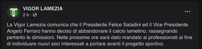 L’illusione di un futuro roseo e le prospettive altisonanti e immaginifiche paventate in questi giorni sono state spazzate via in un caldo pomeriggio estivo. È sotto l’ombrellone che l’idea di realizzare un unico team “Lamezia Terme” per la prossima stagione calcistica calabrese è definitivamente tramontato. La consapevolezza del crollo del castello di carta è arrivata nel pomeriggio, dopo il lapidario post apparso sulla pagina Facebook della Vigor Lamezia, nel quale il presidente Felice Saladini e il suo vice, hanno annunciato le proprie dimissioni. Ma soprattutto hanno annunciato il proprio addio al calcio lametino, forse proprio a causa delle continue e insostenibili pressioni della città e dei tifosi.