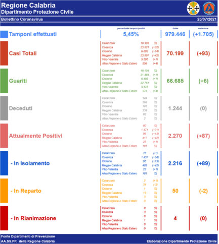 In Calabria, ad oggi, il totale dei tamponi eseguiti sono stati 979446 (+1.705). Le persone risultate positive al Coronavirus sono 70199 (+93) rispetto a ieri.