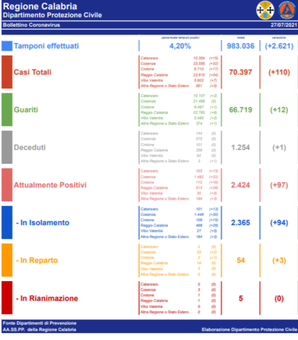 In Calabria, ad oggi, il totale dei tamponi eseguiti sono stati 983036 (+2.621). Le persone risultate positive al Coronavirus sono 70397 (+110) rispetto a ieri.