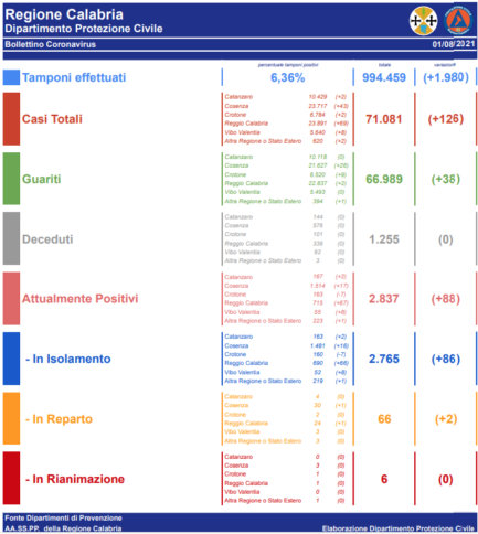 – Reggio Calabria: CASI ATTIVI 715 (24 in reparto, 1 in terapia intensiva, 690 in isolamento domiciliare); CASI CHIUSI 23176 (22837 guariti, 339 deceduti).