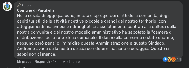 A denunciare l’accaduto, infatti, è stato proprio il sindaco Antonio Landro, attraverso un post su Facebook. «Nella serata di oggi (il riferimento è al 4 agosto ndr) qualcuno, in totale spregio dei diritti della comunità, degli ospiti turisti, delle attività ricettive piccole e grandi del nostro territorio, con atteggiamenti malavitosi e ‘ndranghetisti assolutamente contrari alla cultura della nostra comunità e del nostro modello amministrativo ha sabotato la “camera di distribuzione” della rete idrica comunale».