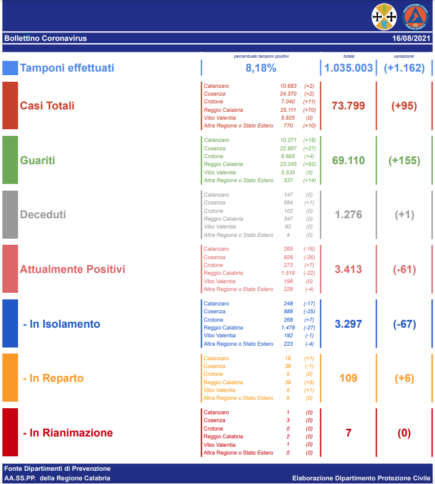 L’Asp di Cosenza comunica che dei 5 nuovi soggetti positivi 3 sono residenti fuori regione. L’Asp di Crotone comunica che dei 12 nuovi soggetti positivi 1 è residente fuori regione. L’Asp di Reggio Calabria comunica 76 nuovi soggetti positivi di cui 6 residenti fuori regione.