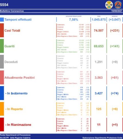 CATANZARO In Calabria, ad oggi, il totale dei tamponi eseguiti sono stati 1.045.875 (+3.047 nelle ultime 24 ore). Le persone risultate positive al Coronavirus sono 74.507, i nuovi contagi sono 231). Si registrano anche nove decessi. In aumento i numeri relativi ai ricoveri e nel reparto di rianimazione. Questi sono i dati giornalieri relativi all’epidemia da Covid-19 comunicati dai Dipartimenti di Prevenzione delle AA.SS.PP. della Regione Calabria.