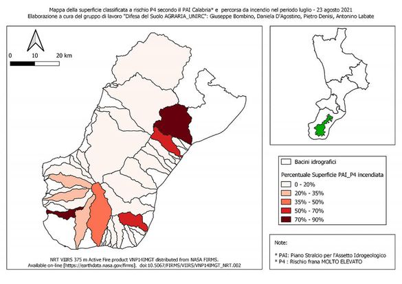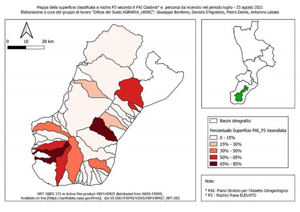 REGGIO CALABRIA «Vi presentiamo una ulteriore interessante elaborazione per contribuire alla individuazione delle aree dove, a causa dei devastanti incendi boschivi occorsi in Aspromonte, più elevato è il rischio idrogeologico». Lo riporta uno studio realizzato dal gruppo di lavoro “Difesa del Suolo” del dipartimento di Agraria dell’Università Mediterranea di Reggio Calabria. Un gruppo composto dai docenti Giuseppe Bombino, Daniela D’Agostino, Pietro Denisi e Antonino Labate. «Le mappe che vi proponiamo – scrivono i docenti – sono state ottenute “mettendo a sistema”, a scala di bacino idrografico, due fondamentali informazioni: la prima, tiene conto delle aree suscettibili di frana, distinte per livello di rischio “molto elevato” (P4) ed “elevato” (P3), secondo la classificazione del PAI (Piano stralcio per l’Assetto idrogeologico della Calabria); la seconda, invece, considera, per ogni bacino idrografico, la quantità di superficie ricadente nelle Classi di Rischio P4 e P3 interessata dal fuoco».