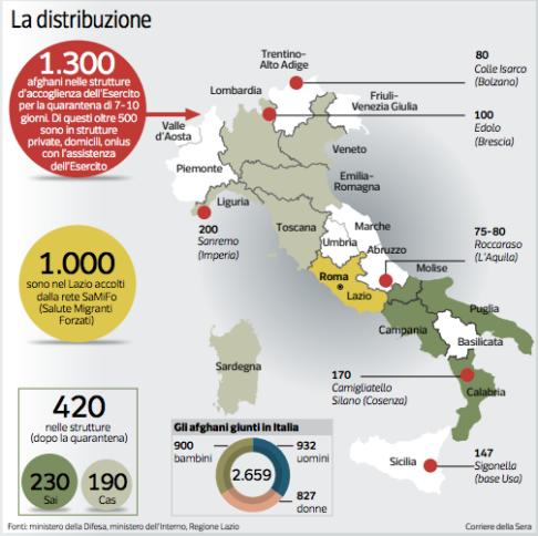 In quarantena – secondo quanto riferisce il Corriere della Sera – sono invece in circa 1.300, ospiti di strutture per le vacanze dello Stato maggiore della Difesa, gestite dall’Esercito: 170 a Camigliatello Silano (Cosenza), con la Marina, 80 a Colle Isarco (Bolzano), un centinaio a Edolo (Brescia), 75-80 a Roccaraso (L’Aquila), 200 a Sanremo (Imperia), oltre 500 presso alberghi, pensioni, centri di accoglienza con volontari di onlus e ong, ma anche appartamenti di famiglie, parrocchie e associazioni, come Centro Astalli e Sant’Egidio, che forniscono generi di prima necessità. Ci sono poi i 100 sfollati dall’Aeronautica a Montescuro di Celico (Cosenza) e i 140 nella base Usa di Sigonella (Siracusa) che potrebbero almeno in parte rientrare nel circuito dell’accoglienza italiana o essere poi trasferiti negli Stati Uniti. La maggior parte comunque entro una settimana, al massimo 10 giorni — a seconda se siano vaccinati o meno —, entrerà nella rete Sai e Cas, oppure troverà ospitalità da amici e parenti che già risiedono in Italia.