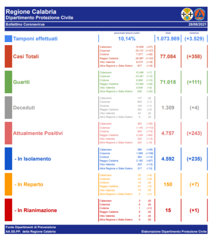 – Reggio Calabria: CASI ATTIVI 2.249 (61 in reparto, 6 in terapia intensiva, 2.182 in isolamento domiciliare); CASI CHIUSI 24.338 (23.984 guariti, 354 deceduti);