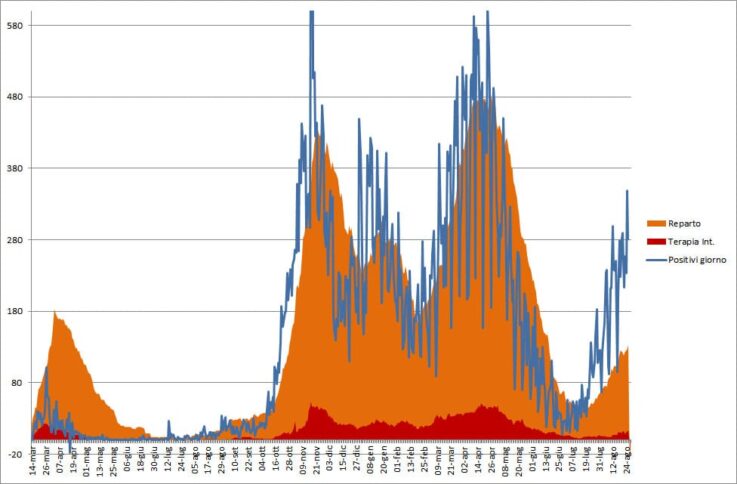 Però ora che abbiamo superato il 60% delle vaccinazioni, si assiste ad un fenomeno che non si era mai visto in precedenza; infatti da luglio 2021 possiamo notare non solo il notevole distacco numerico dei ricoveri rispetto ai nuovi contagi, ma anche una sostanziale stabilità delle terapie intensive, che non seguono più un andamento proporzionale rispetto ai ricoveri in reparto.
