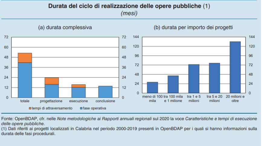 Secondo le stime di Bankitalia, riportate nell’ultimo report sull’economia regionale, ad esempio il tempo medio di realizzazione delle opere pubbliche in Calabria in un ventennio è stato di circa 4 anni e mezzo. Un dato, fanno notare gli analisti di Palazzo Koch che hanno passato a setaccio le opere avviate in Italia tra il 2000 e il 2019, superiore alla media nazionale.