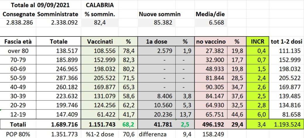 CATANZARO La Calabria, come le altre Regioni, deve ancora raggiungere l’obiettivo della campagna vaccinale: ovvero l’80% di persone immunizzate per scongiurare una nuova stagione di chiusure. Gli hub sul territorio regionale continuano ad effettuare le somministrazioni ogni giorno e «mantengono una media giornaliera di 6600 dosi inoculate». Secondo il resoconto (aggiornato al 9 settembre) dei dati analizzati da Michele Menniti – Gruppo Farmacovigilanza Calabria, e dal direttore professore Giovambattista De Sarro, dell’Università degli Studi “Magna Græcia” di Catanzaro – «mancano ancora circa 160.00 persone da vaccinare per raggiungere la soglia dell’80%; al momento tale percentuale è stata raggiunta solo nella fascia di età 60-79, ma naturalmente è auspicabile che tutte queste percentuali continuino ad aumentare – affermano – mentre negli ultimi 13 giorni sono state somministrate 85.382 dosi, con un incremento medio ponderale pari al 3,4%».