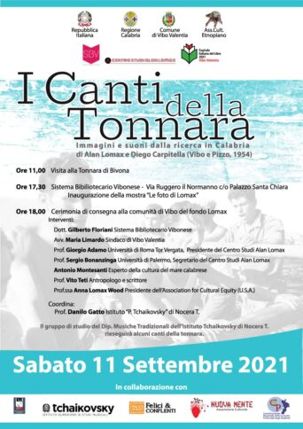«L’evento è realizzato con la collaborazione dell’associazione “Arpa” , dell’Istituto “P. Tchaikossky” di Nocera Terinese, di “Felici e Conflenti” dell’associazione culturale Nuovamente, e del Coordinamento regionale delle Consulte provinciali degli studenti. Il lavoro sarà presentato nel corso di un convegno che si terrà sabato 11 settembre alla presenza di Anna Lomax, e sarà coordinato da Danilo Gatto. Parteciperanno anche gli altri autori del volume: il professor Giorgio Adamo, il docente Sergio Bonanzinga, rispettivamente presidente e segretario del Centro Studi Alan Lomax, e lo storico, nonché profondo conoscitore della Tonnara di Bivona, Antonio Montesanti oltre che l’antropologo Vito Teti, il professor Giuseppe Giordano, Nico Staiti musicologo e docente università di Bologna L’iniziativa di sabato prossimo si articola in diversi momenti, a partire dalla visita alla Tonnara di Bivona alle 11. Alle 17.30, nella sede del Sistema bibliotecario vibonese, in via Ruggero il Normanno a Palazzo Santa Chiara, è prevista l’inaugurazione della mostra “Le foto di Lomax”. Alle 18, la cerimonia di consegna alla comunità di Vibo del fondo Lomax. Al termine del convegno – conclude la nota – un gruppo di allievi dell’Istituto Tchaikovsky di Nocera Terinese, in collaborazione con il festival Tarantella Power e il festival Felici&Conflenti, riproporranno alcuni dei canti registrati da Lomax e Carpitella nel 1954 alla Tonnara dell’Angitola».
