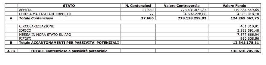 I dati del Rendiconto relativo all’esercizio finanziario 2020 dell’amministrazione: il fondo rischi legali è fissato in oltre 136 Meuro