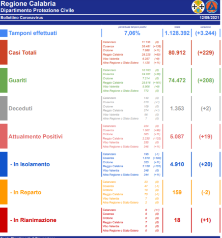 – Catanzaro: CASI ATTIVI 224 (23 in reparto, 6 in terapia intensiva, 195 in isolamento domiciliare); CASI CHIUSI 10912 (10763 guariti, 149 deceduti).