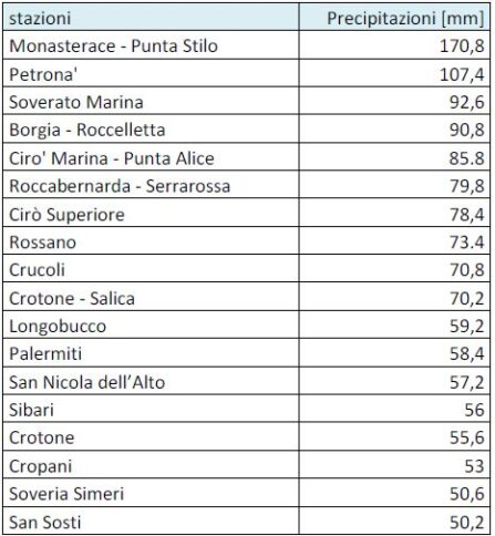 Con un valore di 170,8 mm di pioggia è stato il centro che ha registrato il valore più alto. Seguono Petronà e Soverato – I DATI DELL’ARPACAL