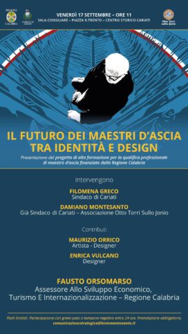 CARIATI «“Il futuro dei maestri d’ascia tra identità e design”. È, questo, il titolo dell’evento pubblico di presentazione del progetto di alta formazione per la qualifica professionale di Maestro d’Ascia finanziato nei mesi scorsi dalla Regione Calabria, in programma domani, venerdì 17 settembre, alle ore 11, nella sala consiliare di Piazza Rocco Trento, nel centro storico. All’iniziativa interverrà anche l’assessore regionale allo Sviluppo Economico, Turismo e Internazionalizzazione, Fausto Orsomarso». È quanto fa sapere il sindaco di Cariati Filomena Greco esprimendo «soddisfazione e ringraziando a nome suo personale e dell’Esecutivo cittadino la Regione Calabria per aver sostenuto – sottolinea – con convinzione un percorso di valorizzazione, promozione e rilancio manageriale di uno dei patrimoni identitari più importanti e qualificanti della nostra terra».