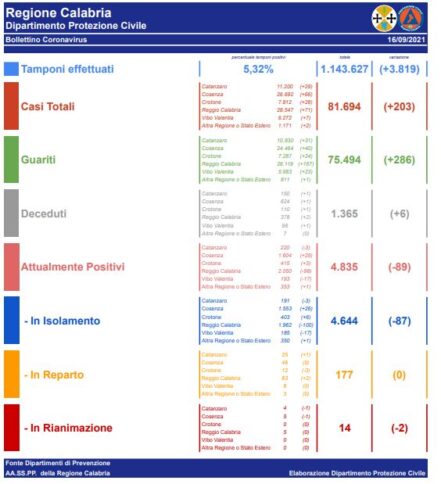 – Reggio Calabria: CASI ATTIVI 2.050 (83 in reparto, 5 in terapia intensiva, 1.962 in isolamento domiciliare); CASI CHIUSI 26.497 (26.119 guariti, 378 deceduti);