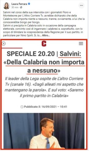 CATANZARO «Salvini nel corso della sua intervista con i giornalisti Floro e Monteleone per L’Altro Corriere Tv, avrebbe dichiarato che della Calabria non importa niente a nessuno, tranne, ovviamente, a lui che la conoscerebbe borgo per borgo». Lo scrive sui social l’europarlamentare del Movimento 5 stelle Laura Ferrara. «Salvini si precipita in Calabria solo in occasione della campagna elettorale – aggiunge – convinto così di ingannare i calabresi e, soprattutto, con lo scopo di blindare la vicepresidenza della Regione per il suo partito, in particolare per Nino Spirlì. Sì, lo stesso Spirlì così certo di aver svolto male il suo ruolo da vicepresidente prima e da facente funzioni poi, da sottrarsi alla prova delle urne e al giudizio dell’elettorato in attesa, il 5 ottobre, di una nomina calata dall’alto. Dopo tutto se oggi ce lo ritroviamo al Governo della Calabria è perché l’allora presidente, la compianta Jole Santelli, lo nominò da esterno».