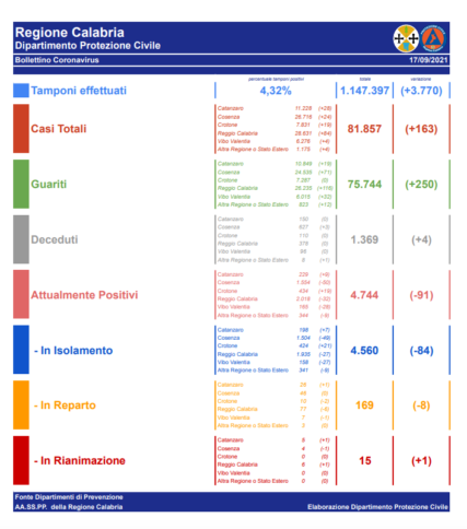 – Vibo Valentia: CASI ATTIVI 165 (7 in reparto, 0 in terapia intensiva, 158 in isolamento domiciliare); CASI CHIUSI 6.111 (6.015 guariti, 96 deceduti). L’Asp di Crotone comunica 23 nuovi soggetti positivi di cui 3 migranti. L’Asp di Cosenza comunica che a seguito di verifiche effettuate, oggi si comunica 1 decesso, avvenuto in data 14/09/2021, di un residente fuori regione in precedenza comunicato tra i residenti.