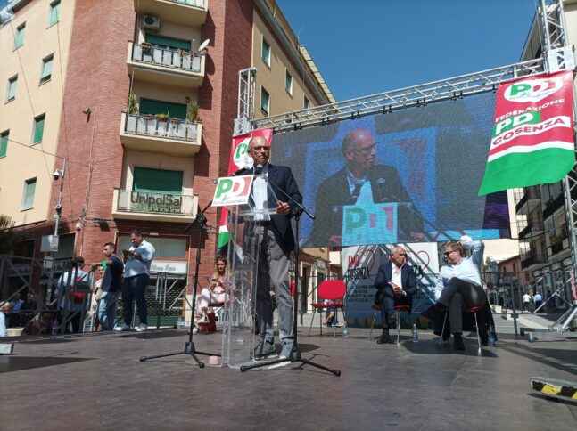 COSENZA La centralissima Piazza Kennedy a Cosenza ospita la manifestazione organizzata dal Partito democratico a sostegno di Franz Caruso, candidato sindaco della città dei bruzi. Sotto un sole cocente, arriva in riva al Crati il segretario dei dem Enrico Letta, questa mattina impegnato già a Lamezia per “un caffè” in compagnia di Amalia Bruni candidata alle Regionali con il centrosinistra. Dal palco allestito al centro della piazza, il commissario del pd calabrese, Stefano Graziano, apre il dibattito e ringrazia quanti stanno sostenendo con forza e vigore la campagna elettorale.