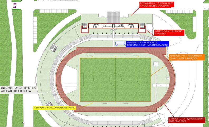 Tre le aree di intervento previste: Rifacimento del campo in erba sintetica, realizzazione illuminazione a led del campo, posa vasca d’accumulo e sistema di irrorazione; Manutenzione degli spogliatoi e dei sistemi di approvvigionamento energetico ed idrico; Riqualificazione della pista di atletica leggera.