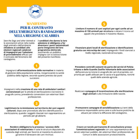 CATANZARO «Abbiamo chiesto ai 4 candidati alle prossime elezioni regionali un impegno pubblico verso i cittadini affinché la lotta al randagismo diventi una priorità e una realtà. L’adesione al nostro manifesto di Amalia Bruni e Luigi De Magistris è un segnale importante ma non ci fermiamo qui. Auspichiamo di avere l’adesione anche di Roberto Occhiuto e Mario Oliverio poiché per agire a monte del problema servono fatti e le istituzioni non possono sottrarsi ancora, indipendentemente dal colore politico di chi sarà chiamato a governare la Regione. Le 10 azioni urgenti che abbiamo individuato hanno incontrato subito anche l’adesione di 16 enti no profit impegnati nella tutela degli animali nelle province di Cosenza, Crotone, Catanzaro e Reggio Calabria. Una unione di intenti non scontata in una terra, la Calabria, dove il volontariato spesso è in conflitto e poco unito di fronte alle istituzioni», afferma Sara Turetta, Presidente di Save the Dogs. Ad un mese esatto dalla tragica morte di Simona Cavallaro, aggredita da un branco di cani da guardiania a Satriano i riflettori devono rimanere puntati sul randagismo per mantenere alta l’attenzione su un problema che in Calabria ha raggiunto dimensioni drammatiche a causa delle gravi inadempienze delle istituzioni, che hanno sistematicamente disatteso quanto previsto dalla legge regionale, e delle infiltrazioni della criminalità nella gestione dei canili convenzionati con le pubbliche amministrazioni.