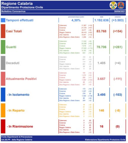 CATANZARO In Calabria, ad oggi, il totale dei tamponi eseguiti sono stati 1.192.636 (+3.583).Le persone risultate positive al Coronavirus sono 83.768 (+154) rispetto a ieri.Questi sono i dati giornalieri relativi all’epidemia da Covid-19 comunicati dai Dipartimenti di Prevenzione delle AA.SS.PP. della Regione Calabria.