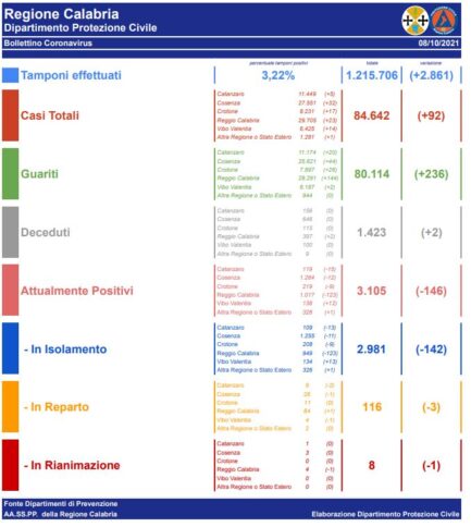 CATANZARO In Calabria, ad oggi, il totale dei tamponi eseguiti sono stati 1215706 (+2.861).Le persone risultate positive al Coronavirus sono 84642 (+92) rispetto a ieri. Questi sono i dati giornalieri relativi all’epidemia da Covid-19 comunicati dai Dipartimenti di Prevenzione delle AA.SS.PP. della Regione Calabria.