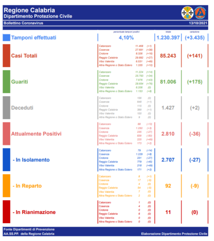 – Reggio Calabria: CASI ATTIVI 839 (54 in reparto, 6 in terapia intensiva, 779 in isolamento domiciliare); CASI CHIUSI 29053 (28654 guariti, 399 deceduti);