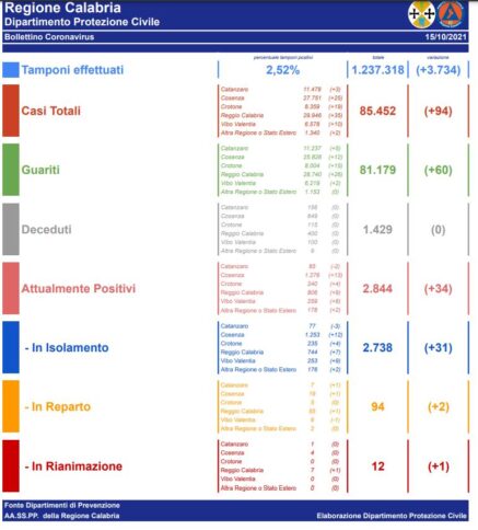 CATANZARO In Calabria, ad oggi, il totale dei tamponi eseguiti sono stati 1.237.318 (+3.734).Le persone risultate positive al Coronavirus sono 85.452 (+94) rispetto a ieri.Questi sono i dati giornalieri relativi all’epidemia da Covid-19 comunicati dai Dipartimenti di Prevenzione delle AA.SS.PP. della Regione Calabria.