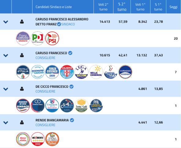 A spoglio concluso, Franz Caruso ottiene 14.413 voti (57,59%) contro i 10.615 (42,41%) Francesco Caruso. Dopo un iniziale testa a testa, il divario tra i contendenti si è andato progressivamente allargando. Tant’è che nel quartier generale del candidato socialista le prime scene di esultanza sono iniziate ancora prima delle 16, quando sia dalle periferie che dal centro della città quasi tutti i risultati di sezione premiavano lo schieramento riformista. Caruso, nella sua prima dichiarazione a caldo, ha parlato di una «vittoria della città, che voleva cambiare». E in effetti Cosenza passerà al centrosinistra dopo 10 anni di gestione targata Mario Occhiuto, fratello di Roberto, neo governatore della Regione.