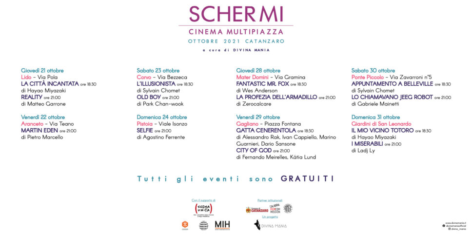 Venerdì 29 ottobre, ci si sposterà a Gagliano, in piazza Fontana. Alle 18.30 sarà il momento de “La gatta cenerentola”, pluripremiato ai David di Donatello e ai Nastri d’argento del 2018, e alle 21 “City of God” di Fernando Meirelles, vincitore di svariati premi ai Bafta 2003. Sabato 30 tutti a Pontepiccolo, in via Zavarroni, dove saranno proiettati “Appuntamento a Belleville” di Sylvain Chomet, ore 18.30, e “Lo chiamavano Jeeg Robot” di Gabriele Mainetti, alle ore 21, premiatissimo nel 2016 ai David di Donatello e ai Nastri d’argento. Chiusura il 31 ottobre ai Giardini di San Leonardo con “Il mio vicino Totoro” di Hayao Miyazaki, alle 18.30 e “I miserabili” di Ladj Ly, alle 21, Miglior film ai Cèsar del 2020 Gli eventi sono gratuiti. Schermi – conclude l’associazione – è realizzato con il supporto di Scena Unita, Cesvi Onlus, La Musica che gira Music Innovation hub. Partner istituzionali sono il Comune di Catanzaro, la Calabria Film commission e l’Anec Calabria. La produzione esecutiva è a cura di Open Fields Productions».