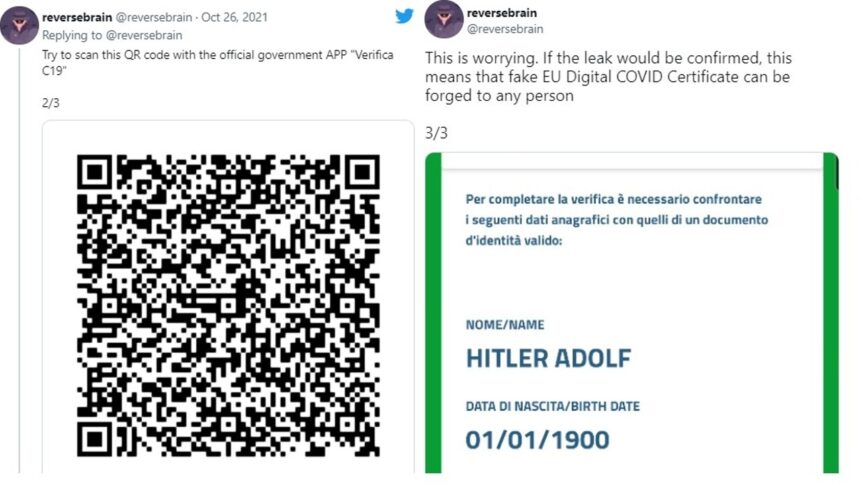 Codice che effettivamente risultava valido e, appunto, intestato ad Adolf Hitler. «Se la perdita fosse confermata – aggiungeva – significa che il falso certificato Covid dell’UIe può essere contraffatto da chiunque».