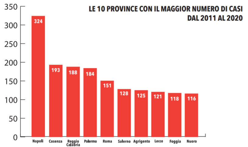 Su base provinciale la Calabria arriva ad occupare ben due gradini del podio se si considera che ai 324 casi censiti nella provincia di Napoli fanno eco i 193 di Cosenza e i 188 di Reggio Calabria. In quattro delle cinque province della regione si registra un numero di casi superiore a 100 negli ultimi 10 anni (l’unica tra i 70 e i 99 casi registrati è la provincia di Crotone).