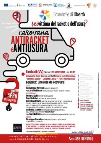 Il prossimo 10 novembre alle ore 16, la Carovana farà tappa a Limbadi, nei locali dell’Università della ricerca, della memoria e dell’impegno “Rossella Casini” in località Santa, I trav. Viale Europa. L’ incontro, organizzato con il Coordinamento provinciale di Libera Vibo Valentia, dal titolo “Legalità: una rete da costruire” vedrà la partecipazione di esponenti del mondo delle istituzioni locali e nazionali: Roberta Lulli, Prefetto di Vibo Valentia, Camillo Falvo, Procuratore di Vibo Valentia, e monsignor Attilio Nostro, Vescovo della Diocesi di Mileto, Nicotera, Tropea. L’intento dell’iniziativa è parlare delle attività del progetto e per siglare due importanti protocolli di intesa con la Procura di Vibo Valentia e con la Prefettura della provincia vibonese per rafforzare la rete territoriale di supporto al progetto.