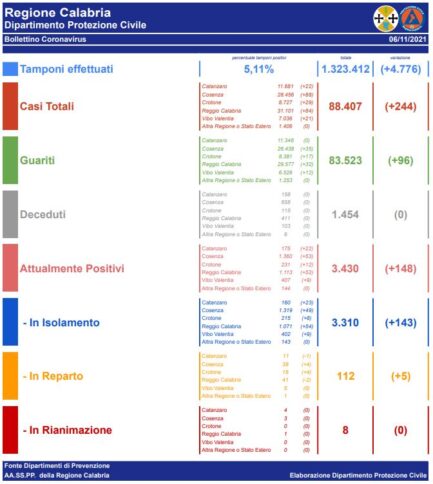 CATANZARO In Calabria, ad oggi, il totale dei tamponi eseguiti sono stati 1.323.412 (+4.776).Le persone risultate positive al Coronavirus sono 88.407 (+244) rispetto a ieri.Questi sono i dati giornalieri relativi all’epidemia da Covid-19 comunicati dai Dipartimenti di Prevenzione delle AA.SS.PP. della Regione Calabria.
