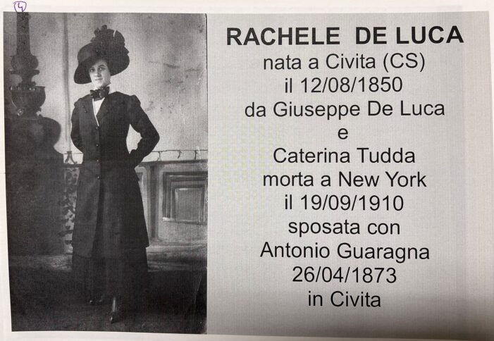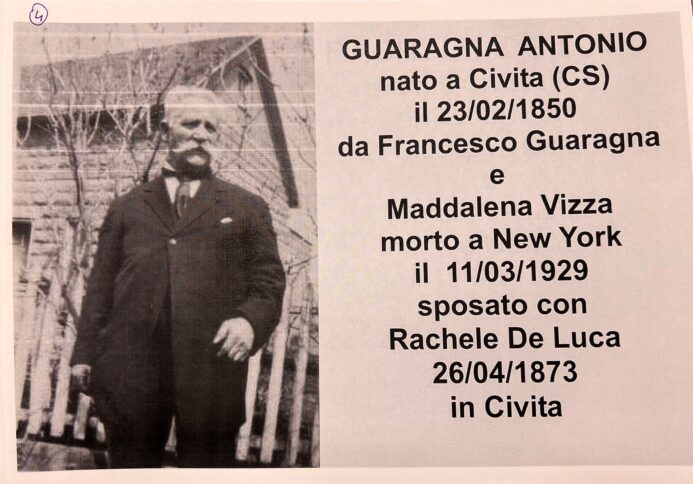 «Il padre era nato a Civita in contrada Laxsa nel 1850 – sostiene Peppino Martire – mentre la mamma, Rachele De Luca, era nata in contrada S. Antonio, sempre a Civita nel 1850. Il documento che attesta ciò è datato 24 aprile 1873 e reca la firma dell’Economo Coadiutore, Curato Antonio Pellicano, della Chiesa di Civita sotto il titolo di Santa Maria Assunta in Cielo e si tratta del processetto matrimoniale e relativa pubblicazione degli sposi Antonio Guaragna, figlio di Francesco e Maddalena Vizza, e di Rachele De Luca, figlia del fu defunto Giuseppe e di Caterina Tudda».