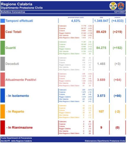 CATANZARO In Calabria, ad oggi, il totale dei tamponi eseguiti sono stati 1349847 (+4.833). Le persone risultate positive al Coronavirus sono 89429 (+219) rispetto a ieri.