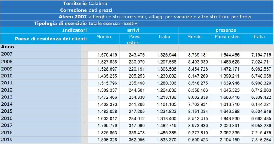 Nonostante la crescita registrata nel numero di arrivi e presenze da altri Paesi, in questi 12 anni il flusso dei turisti che ha visitato la Calabria proveniente da oltre confine resta decisamente basso. Nell’ultima rilevazione presa a campione – quella del 2019 – si rileva che il 19,1% degli arrivi (nonostante sia stato l’anno record, con 362.956 turisti stranieri registrati in Calabria) e il 23,07% delle presenze (pari a 2.194.159) sono stranieri. Numeri in salita rispetto al 2007 quando c’erano stati 243.475 arrivi e 1.544.466 presenze in Calabria. Ma con percentuali decisamente lontane dalla media nazionale: nel 2019 il turismo estero ha costituito il 50,2% delle presenze e circa la metà degli arrivi totali registrati in Italia. Ovviamente meno turisti stranieri minore la possibilità della filiera calabrese di ottenere risorse economiche importanti. Visto che in percentuale sono quelli che spendono di più.