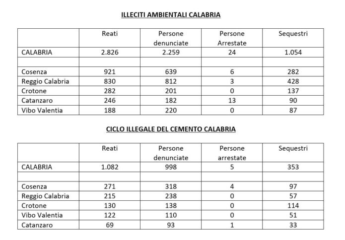 Nel ciclo illegale del cemento la Calabria si colloca al 4°posto nella classifica delle regioni italiane con 1082 reati. Nella top20 delle province italiane, infatti, Cosenza è al 2° posto con 271 reati; Reggio si colloca al 5°posto; Crotone al 13° e Vibo al 14°posto.