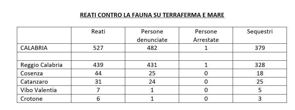 Nei reati contro la fauna, su terraferma e a mare, 5°posto per la Calabria con 527 reati. Reggio Calabria al 5°posto in Italia. Nella pesca illegale per km di costa, la Calabria è al 3° posto con 374 reati su 111,7 km di costa (3,3 reati per km di costa).